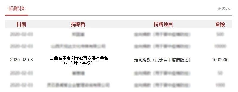 2020年2月3日,山西省中維陽(yáng)光教育發(fā)展基金會(huì)攜北大培文學(xué)校共同捐資人民幣100萬(wàn)元,用于疫情防控工作。