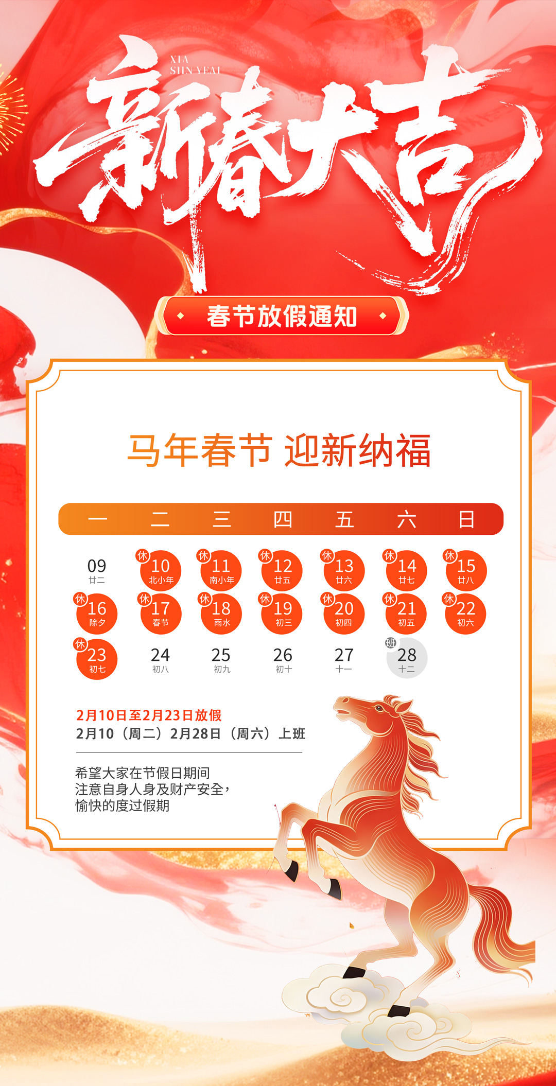 春節(jié)臨近,廣州速紅網(wǎng)絡(luò)科技有公司2025年春節(jié)假期安排如下:2026年2月10日-2月23日放假,共14天,2月24日(初八)上班。