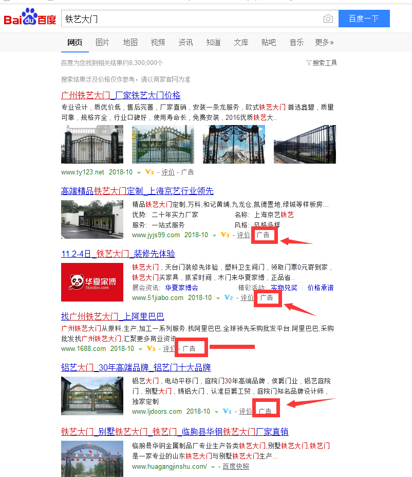 使用過(guò)百度或其他搜索引擎,在搜索框中輸入某一個(gè)關(guān)鍵詞,如鐵藝大門(mén),排名靠前帶有廣告字樣,背景略不同的是競(jìng)價(jià)位置,為俗稱(chēng)的sem位置。如圖:
